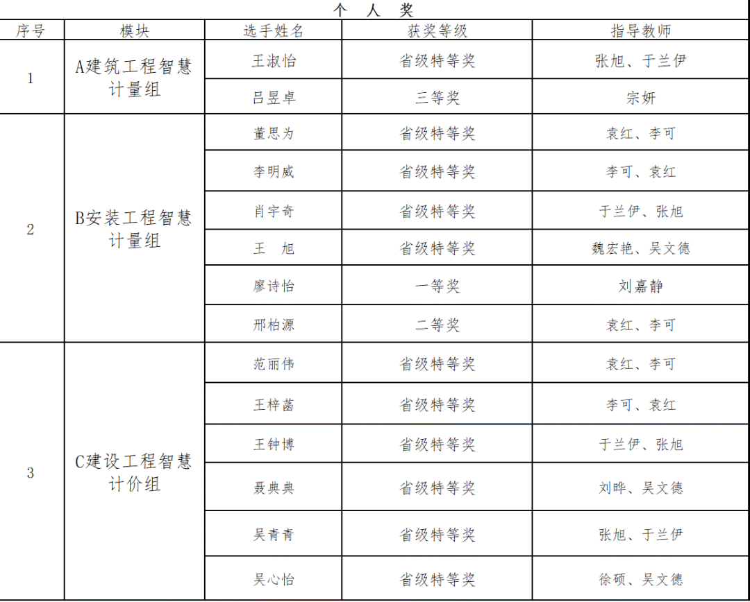 本次竞赛成绩的取得,得益于学院各专业社团的精心组织与学生的积极参与,更离不开指导教师团队全过程、全方位的悉心指导。赛事相关模块内容已深度融入《给水排水工程概预算》《建筑设备安装工程概预算》《建筑电气工程安装与预算》等课程教学,实现了“以赛促教、以赛促学、赛教融合”的良好育人机制。同时,学院还邀请企业专家入校开展专项辅导,有效提升了学生的实战能力与专业素养。