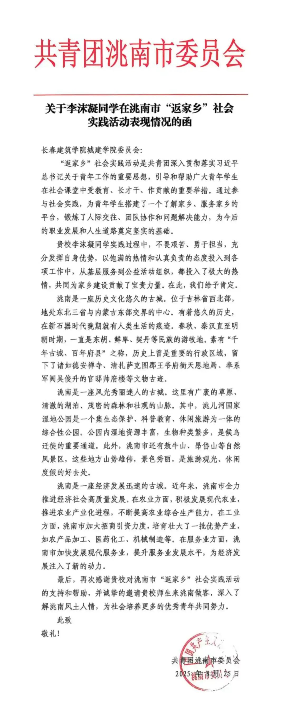 为深化社会实践育人理念,引导青年学子服务基层、回报家乡,长春建筑学院城建学院于2026年寒假开展“返家乡”社会实践活动。在此次社会实践活动中,李沫凝同学踊跃参与家乡建设与各类实践活动,凭借出色的表现获共青团洮南市委员会发文肯定,充分展现了当代大学生的青春担当与责任意识。